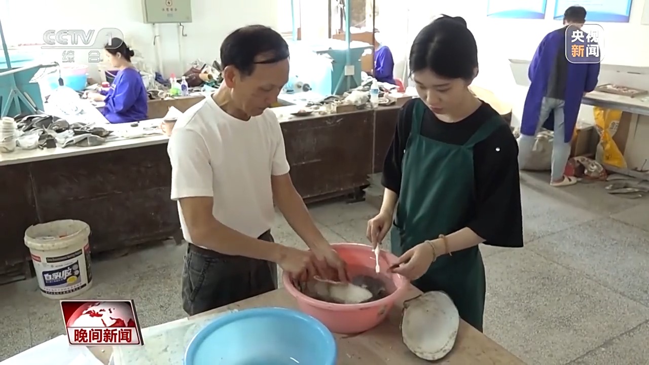在北海貝雕博物館的工作坊,七十歲的林師傅帶著幾位二十來歲的徒弟,一步步教授制作要點(diǎn)。他希望這份手藝能夠一代代傳承下去。