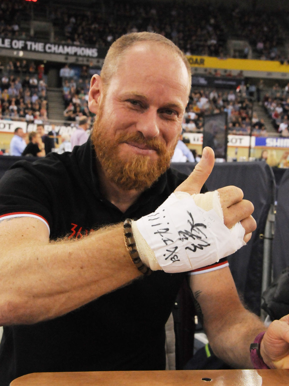 ↑2016年3月6日,2016場地自行車世錦賽賽場上,中國隊的法國籍教練韋蒂展示右手繃帶上的漢字“成功?。。【墶薄?/p>
