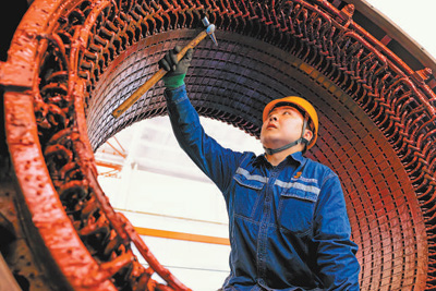 在包(頭)神(木)鐵路機務分公司東勝檢修設備車間,青年職工正對機車主發電機部件進行質量檢查。 張 棖 李尚昆攝影報道