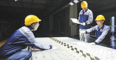 江蘇省蘇州高新區蘇高新股份下屬企業世力源總工程師溫晶晶(右一)與同事開展設計試驗。 本報記者 王偉健攝