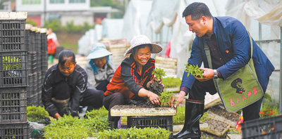 貴州省黔西市雨朵鎮小水井村駐村第一書記符蘭平(右一)向村民了解生產情況。 周訓超攝(人民視覺)
