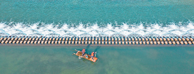 湖南省永州市東安縣白牙市鎮鐵爐村村干部(左)與志愿者在湘江一級支流紫水河上打撈漂浮物。 蔡小平攝(人民視覺)