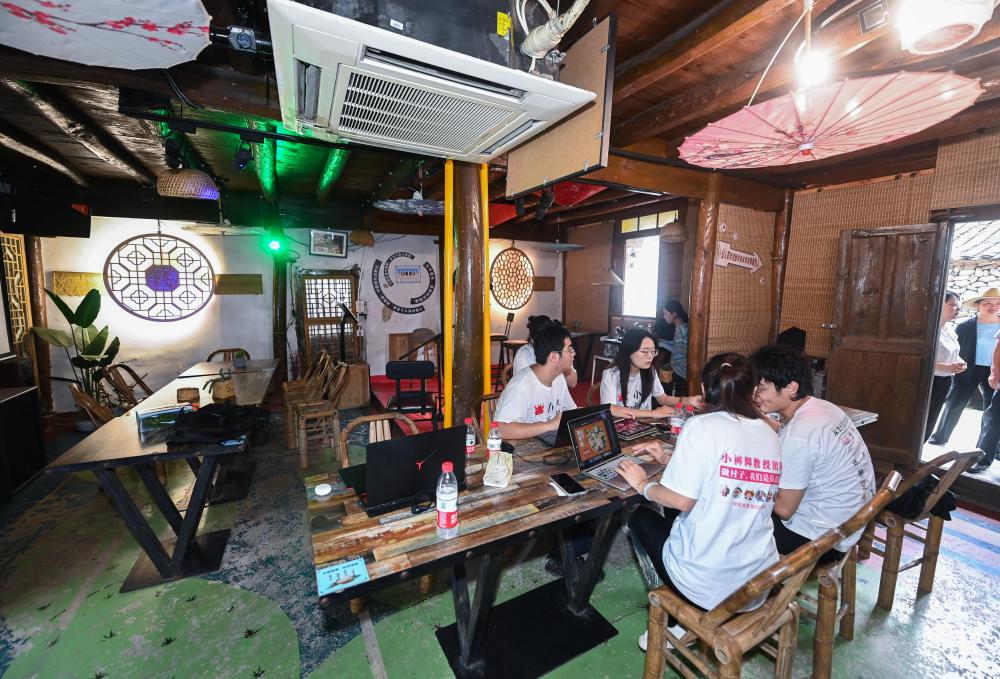 2023年8月11日,高校藝術院系的大學生們在寧波市寧海縣葛家村的特色酒吧內討論村落藝術改造提升的設計方案。 新華社記者 徐昱 攝