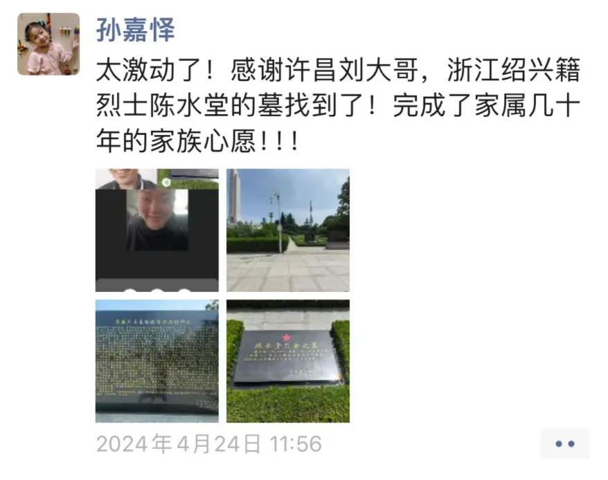 隨后,孫嘉懌聯系了許昌當地的志愿者,在烈士陵園內,他們找到了陳水堂烈士的名字。從接到求助到完成,前后不到24小時。然而,在孫嘉懌經歷的案例中,這樣的其實是極少數。