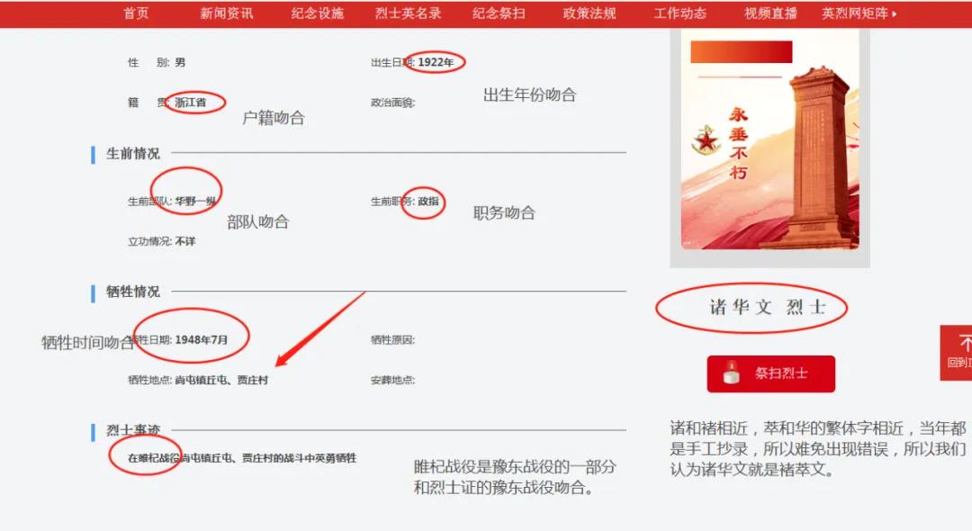 基本信息中,諸華文的出生年份、戶籍、生前情況和犧牲情況都與褚萃文吻合;姓名方面,“諸”與“褚”偏旁相似,而華的繁體寫法(華)與萃也有些相似,可能是登記時出現了錯誤。