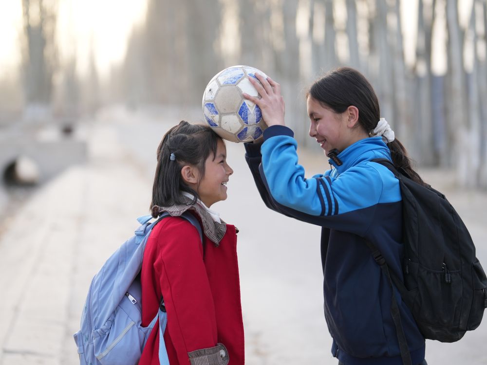 “我的紙飛機呀飛呀飛,飛到了蘆蕩邊。帶我去看落日晚霞,還有開滿花的田野……”姐妹倆給水指導唱了她們學過的歌。水指導給她們送了嶄新的足球,勉勵她們要好好踢球,也要好好學習。