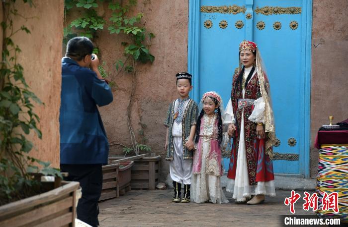 5月4日,游客帶著孩子在喀什古城旅拍。中新網記者 孫亭文 攝