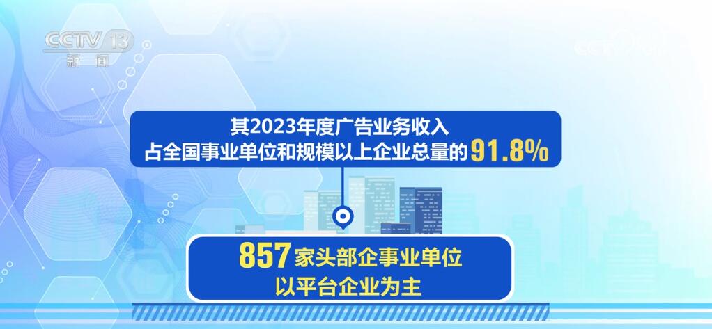據了解,857家頭部企事業單位以平臺企業為主,數據顯示其2023年度廣告業務收入占全國事業單位和規模以上企業總量的91.8%。其中,頭部平臺企業廣告業務收入占其營業收入50%以上。平臺企業的廣告業務不僅帶動廣大中小微廣告企業構建起產業鏈,也為其開展人工智能、新能源、云計算等技術創新提供了資金保障。