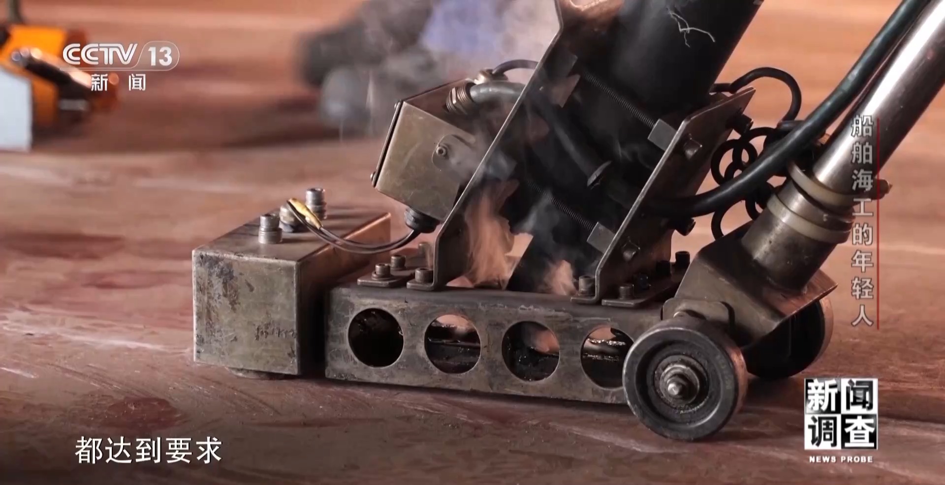 江蘇大洋海洋裝備有限公司技能大師工作室主任 孫玉龍:這個板子比較特殊,它是EH690鋼,硬度比較高,板厚也比較厚。想把它焊合格是很難的,兩個人要焊一天。焊不好它會產生內部缺陷,比如說氣孔、裂紋等一系列的缺陷在里面。