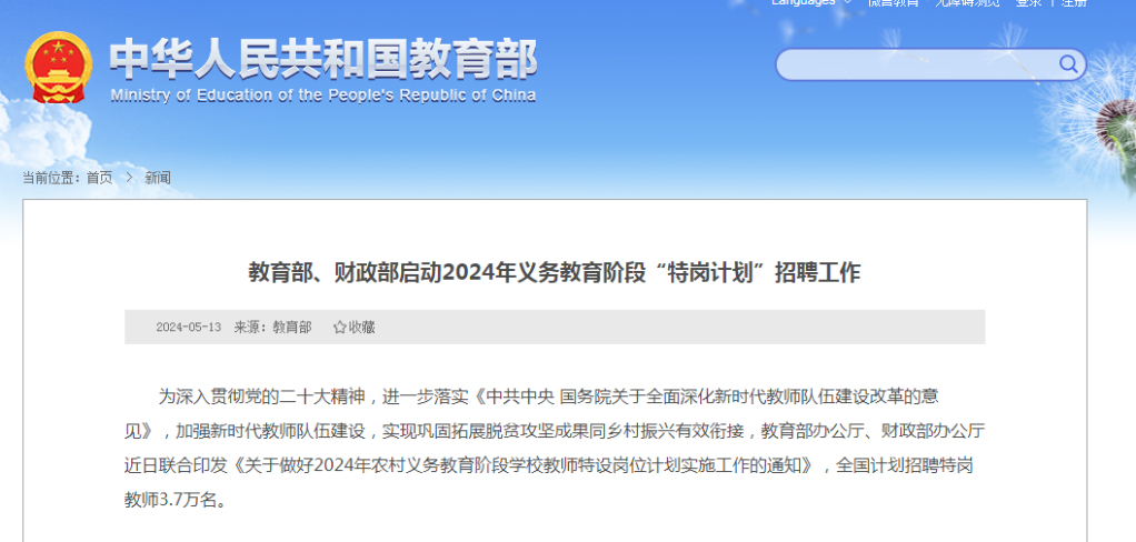 記者5月13日從教育部獲悉,教育部辦公廳、財政部辦公廳近日聯合印發通知,就做好2024年農村義務教育階段學校教師特設崗位計劃實施工作進行部署。根據通知,2024年全國計劃招聘“特崗計劃”教師37000名。