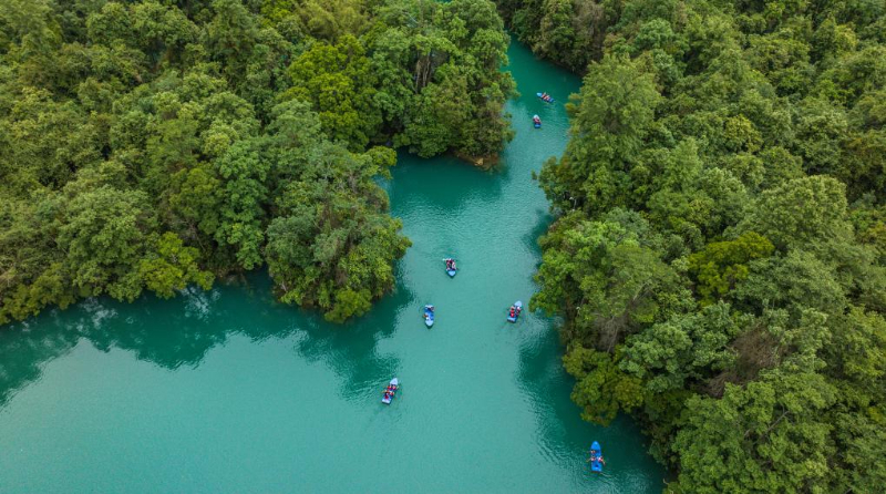 游客在荔波縣小七孔景區劃船游玩(5月16日攝,無人機照片)。新華社記者 陶亮 攝