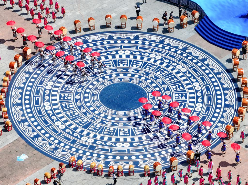 5月15日,苗族同胞在傳統節日踩花山節上載歌載舞(無人機照片)。新華社記者 唐奕 攝