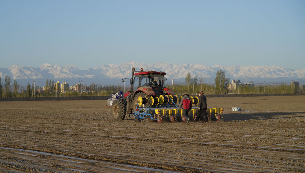 從哈衣繞拉管理的棉田向南望去,可見綿延起伏的天山山脈,終年不化的積雪、線條硬朗的山脊、若隱若現(xiàn)的云杉,像一幅氣勢磅礴的風景畫。一臺高大的機器正按照北斗導航設計的路線筆直地行進,車尾安裝的自動化播種設備將透明的薄膜、黑色的滴灌帶、紅色的包衣棉籽,一并整齊地埋進褐色的泥土里。