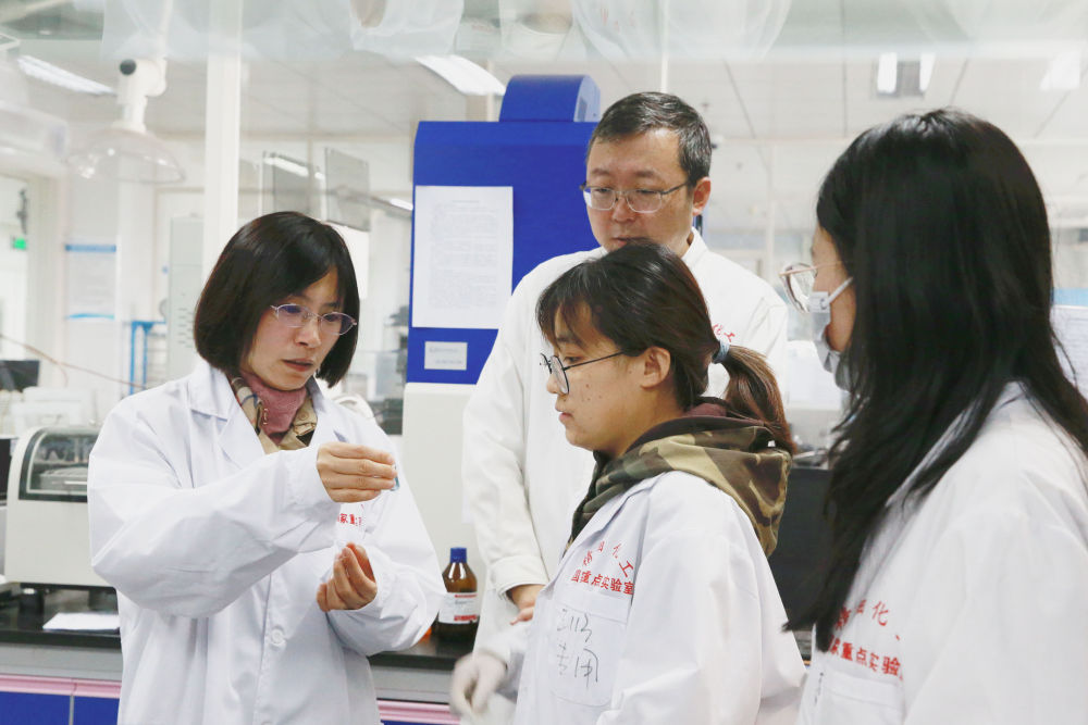 大連理工大學化工學院樊江莉(左)教授與同事及學生查看實驗結果(2021年11月攝)。新華社發