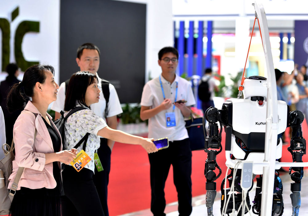 5月24日,在第七屆數字中國建設峰會現場體驗區,觀眾在觀看“移動愛家機器人”。新華社記者魏培全攝