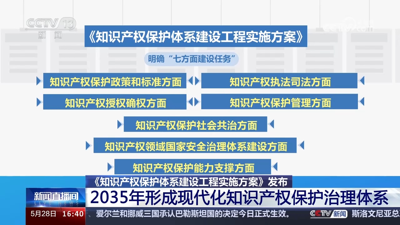 國家知識產權局5月28日舉行新聞發布會,重點介紹《知識產權保護體系建設工程實施方案》(以下簡稱《方案》)有關情況。《方案》明確,到2035年,知識產權保護體系和保護能力現代化基本實現,形成政府履職盡責、執法部門嚴格監管、司法機關公正司法、經營主體規范管理、行業組織自律自治、社會公眾誠信守法的現代化知識產權保護治理體系。
