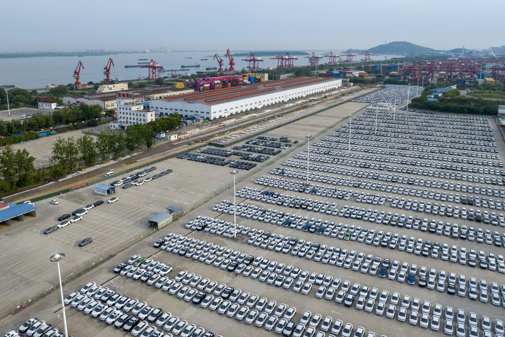5月26日,在安徽蕪湖港朱家橋港區國際集裝箱碼頭,整齊排列的汽車等待出口(無人機照片)。 新華社發(肖本祥 攝)