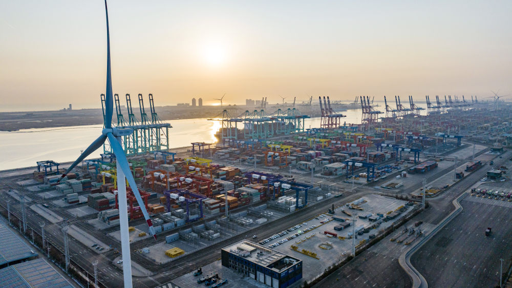 看似平常的碼頭作業(yè),背后卻另有玄機(jī)——整個(gè)過(guò)程達(dá)到了“零碳”排放。2021年底,隨著兩臺(tái)風(fēng)機(jī)葉片緩緩啟動(dòng),這座全球首個(gè)“智慧零碳”碼頭的智慧綠色能源系統(tǒng)開始并網(wǎng)發(fā)電,通過(guò)風(fēng)電、光伏發(fā)出的綠色能源,源源不斷為碼頭生產(chǎn)提供能源。