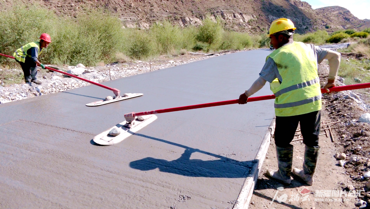 拜城縣鐵熱克鎮農村公路建設現場,工人們抹平路基上的混凝土。魏百寧攝