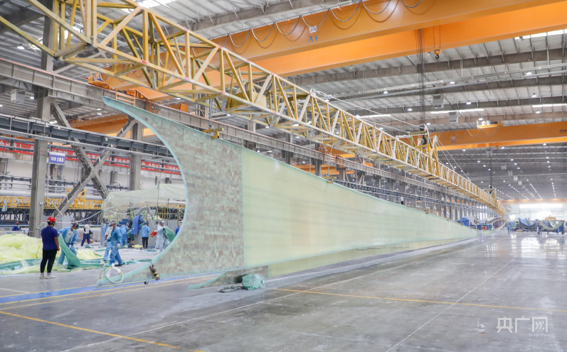 6條百米級及以上葉片生產線上,一個超百米長的“裸裝“風力發電葉片放置車間中央,靜待技術人員“美顏”包裝。自主研制的陸上超大型玻纖葉片便是從這里運往沙漠、戈壁、荒漠地區。
