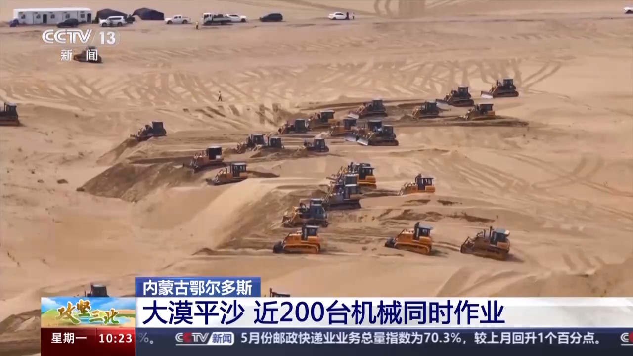 此刻,在我身后,近200臺推土機正在這片沙漠上來回穿行,他們要把這些高低起伏、連綿不斷的沙丘推平整了,再安裝光伏板。這么多推土機具體是如何作業的?技術人員告訴我們,因為地形的原因,今天現場的推平作業大致分為兩個梯隊:第一梯隊負責在沙丘的最上面,把頂部的沙子推下來;第二梯隊隨后,填平沙坑,平整現場。