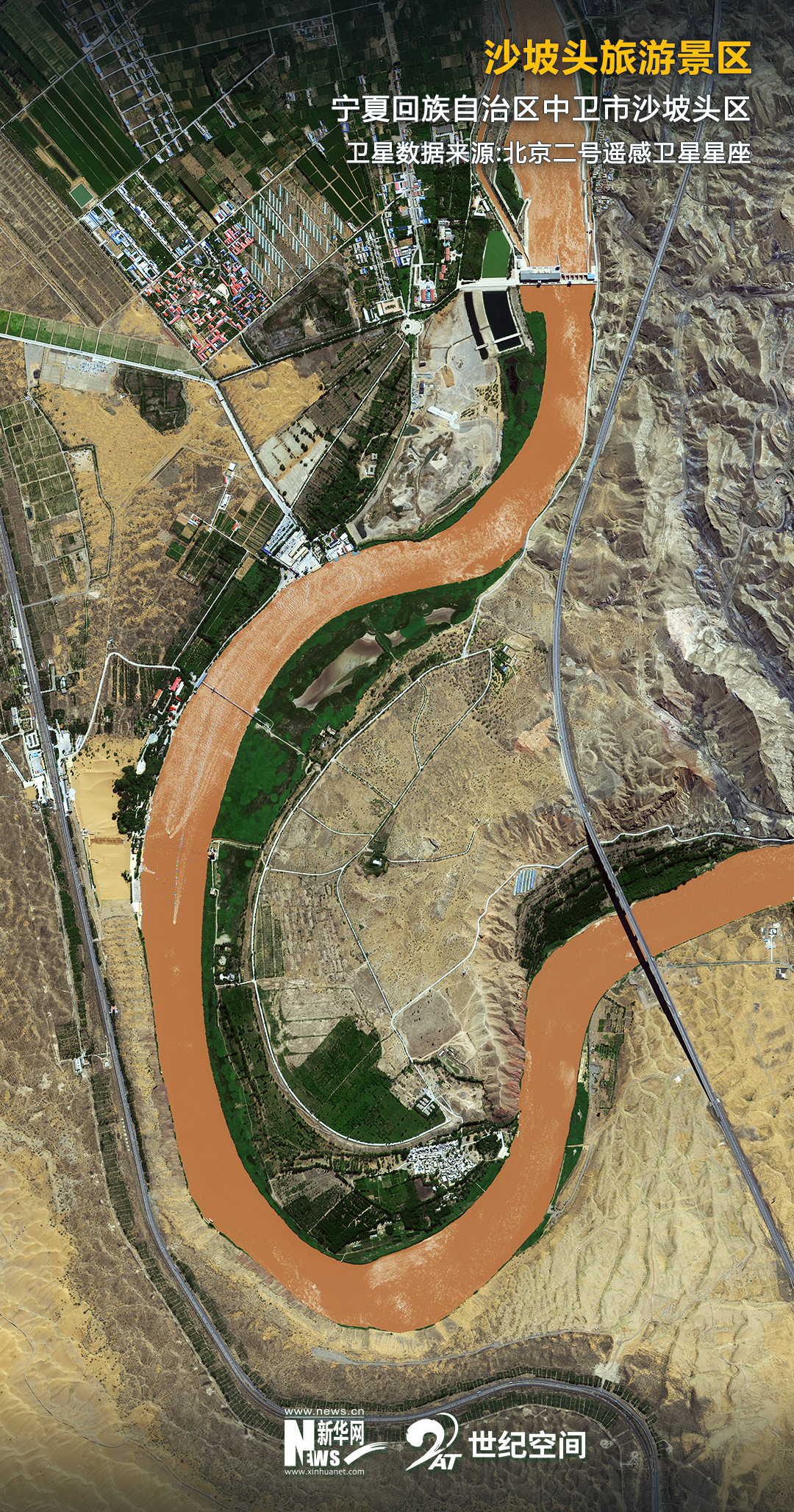 如今,在當地有關部門開展的水系疏浚工程影響下,這里成為沙漠濕地的聚集地。黃河流經此地,畫出了一道蜿蜒的曲線。河的一頭是騰格里沙漠的無垠瀚海,另一頭被一抹蒼翠鑲嵌在河岸邊。