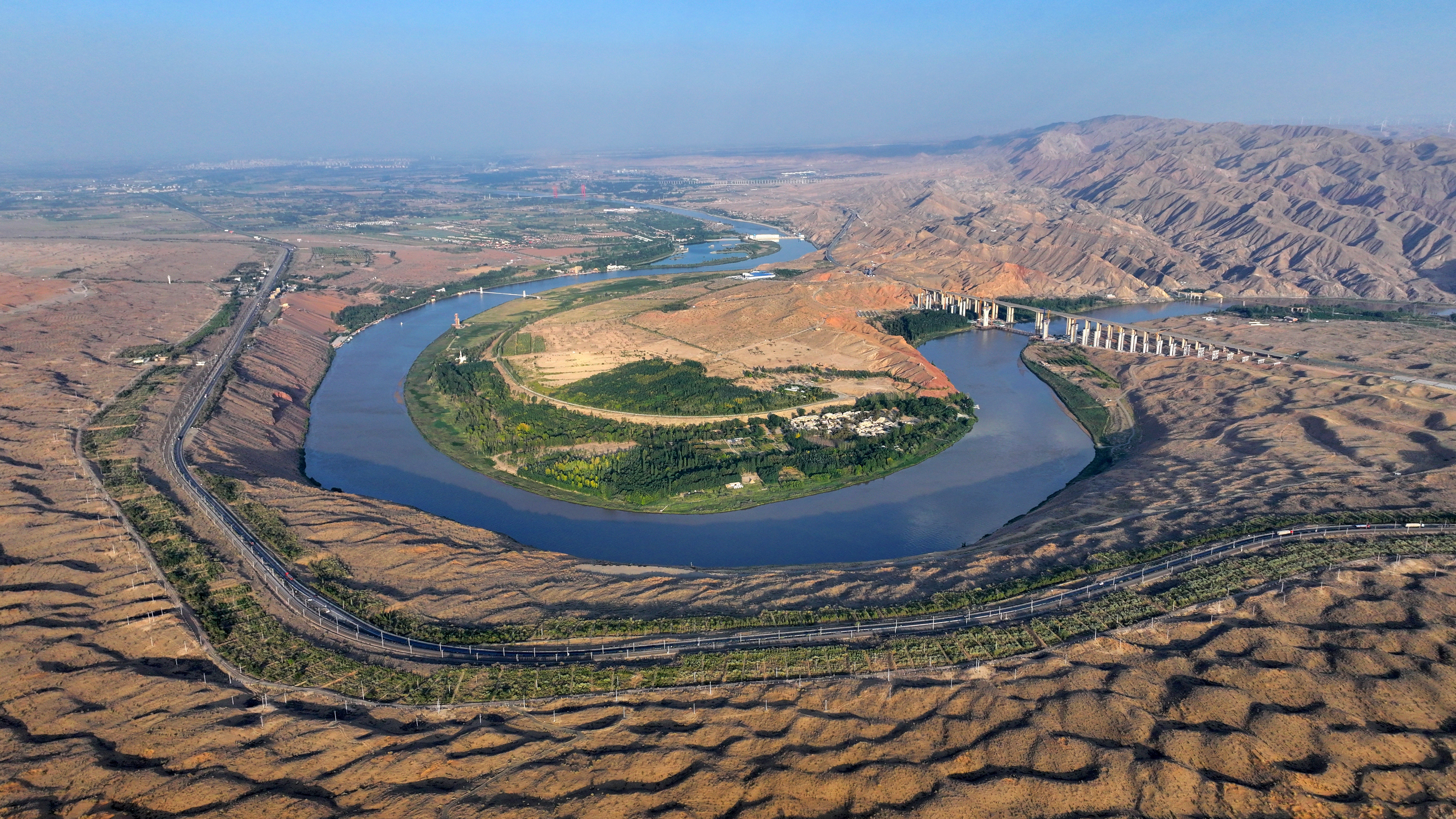 這是流經寧夏中衛市沙坡頭區的黃河(2023年9月6日攝,無人機照片)。新華社記者 王鵬 攝