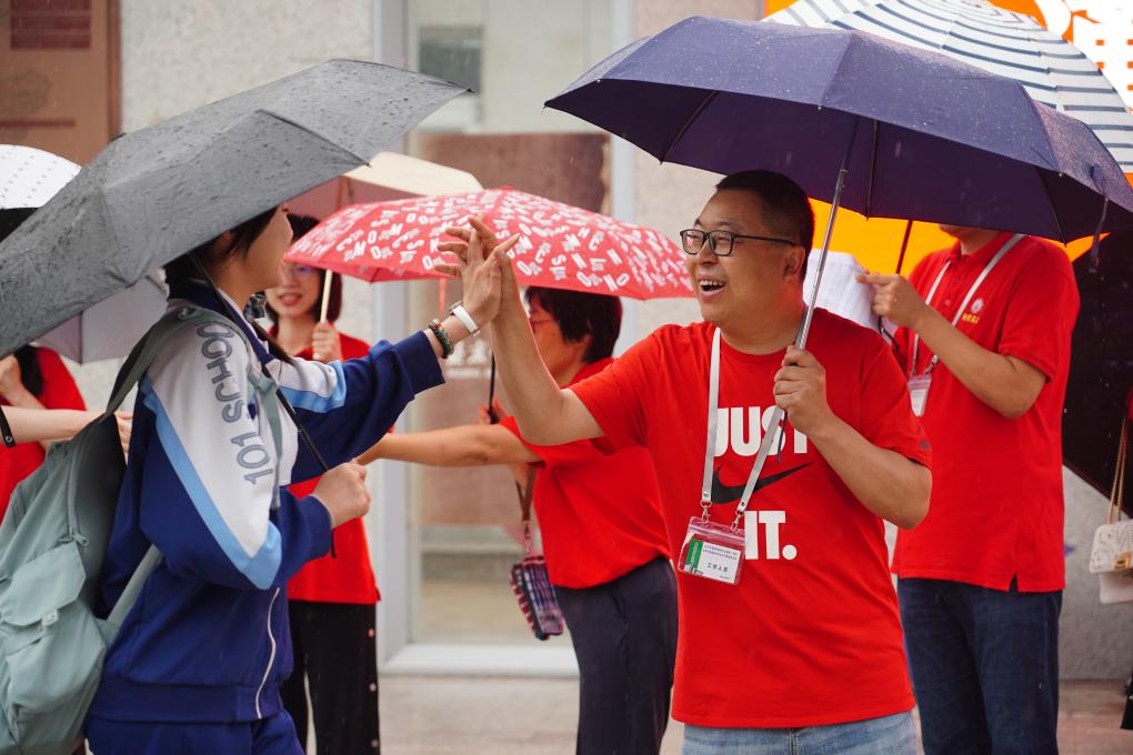 雖然天空下著雨,北京一零一中學的送考老師們還是早早在校門口排成一列,與陸續趕來的考生一一擊掌鼓勁。在校門口刷臉驗證身份后,考生通過提前搭設的紅色晴雨走廊,步入候考區及考場。