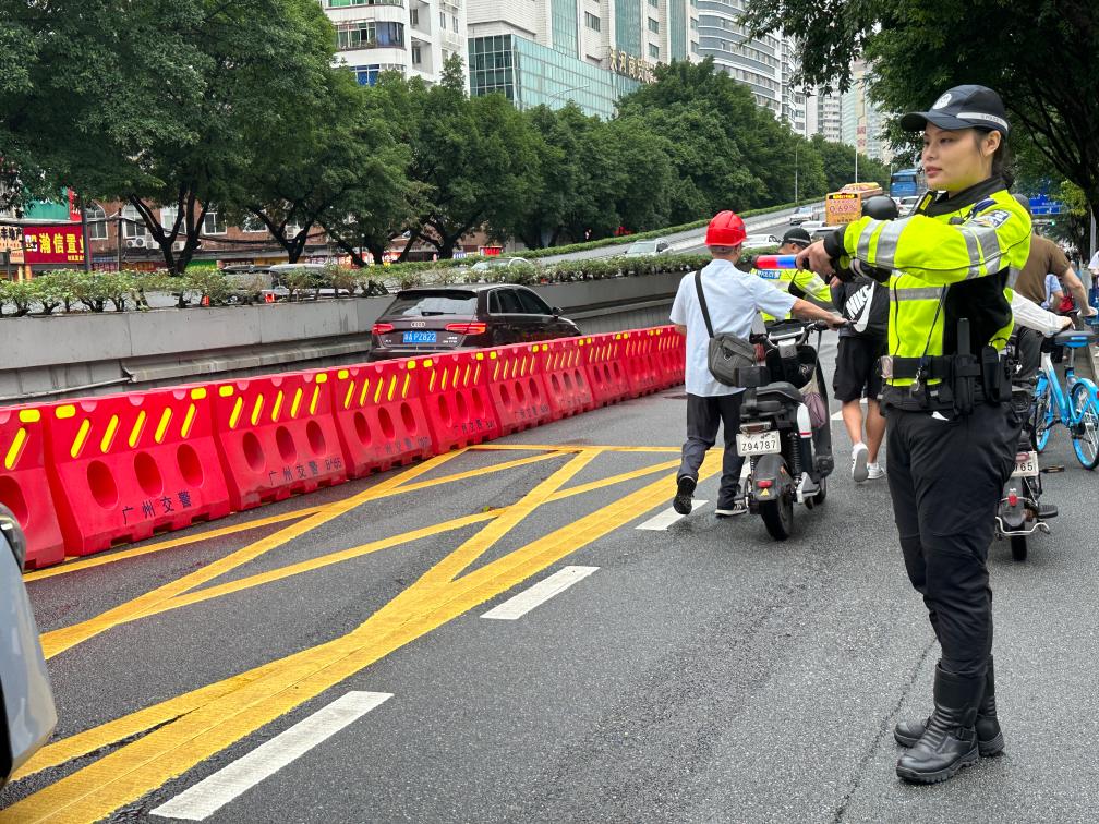 6月7日上午,交警在華南師范大學附屬中學考點外指揮交通。新華社記者楊淑馨 攝