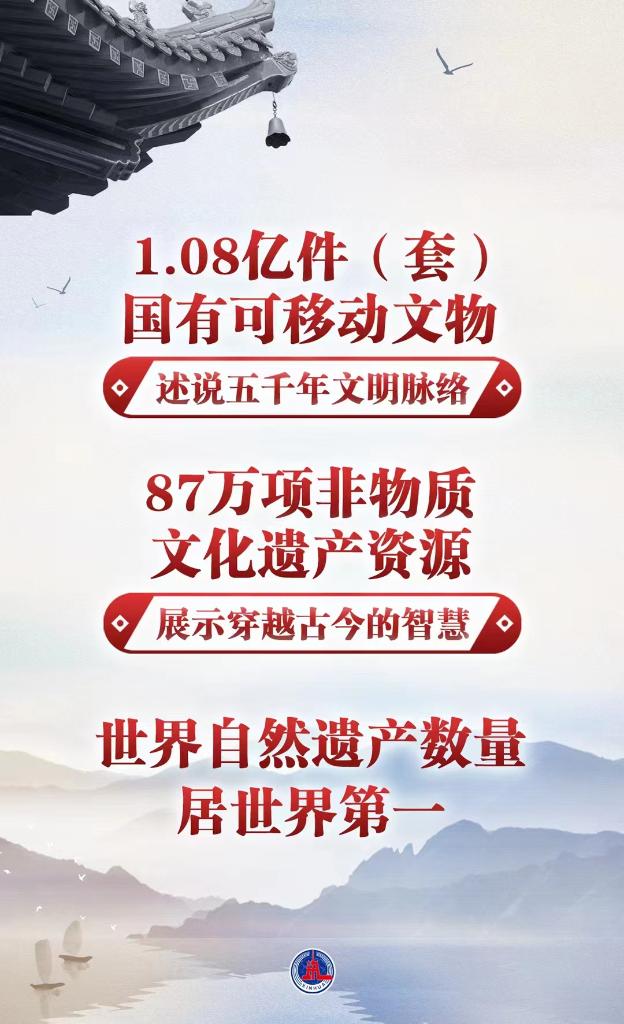 1.08億件(套)國有可移動文物述說五千年文明脈絡,87萬項非物質文化遺產資源展示穿越古今的智慧,世界自然遺產數量居世界第一……文化和自然遺產濃縮著中華文明發展和自然演進的珍貴成果。