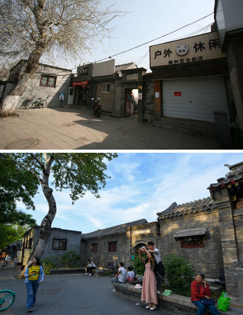 拼版照片:上圖為2018年6月8日拍攝的北京雍和宮大街40號(資料照片);下圖為2024年5月11日拍攝的改造后的同一地點(新華社記者鞠煥宗攝)。新華社發