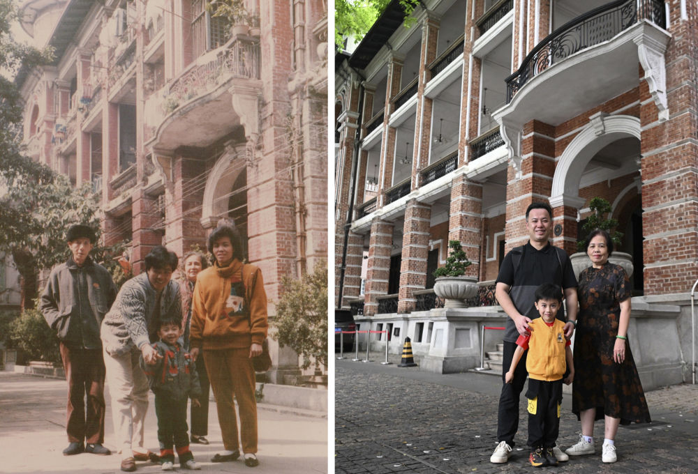 杜煜杰手拿一張老照片,攜母親和兒子重回廣州荔灣區沙面大街舊居樓前,30多年后再拍合影時,回憶瞬間涌上心頭:“我清楚地記得當時全家人要去廣州文化公園觀賞菊展,出發前,我們拍下了這張彩色合照。”