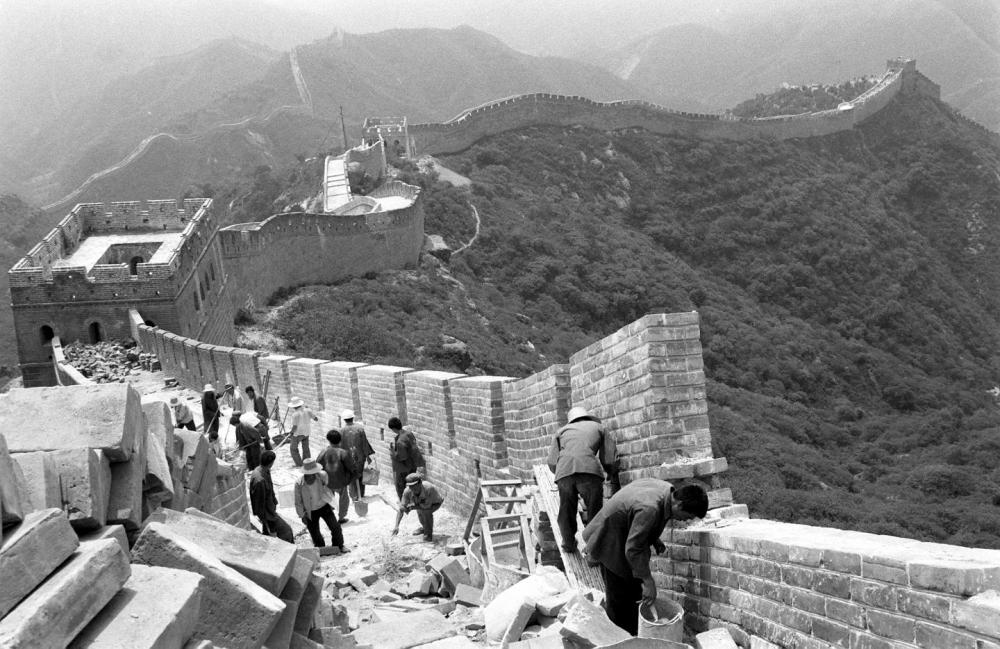 工人正在修復北京八達嶺長城的一段城墻。這是用由北京晚報、八達嶺特區辦事處等單位聯合發起“愛我中華 修我長城”社會贊助活動所獲款項進行修復的第一期工程 (資料照片,1984年8月11日發)。新華社記者 袁汝遜 攝