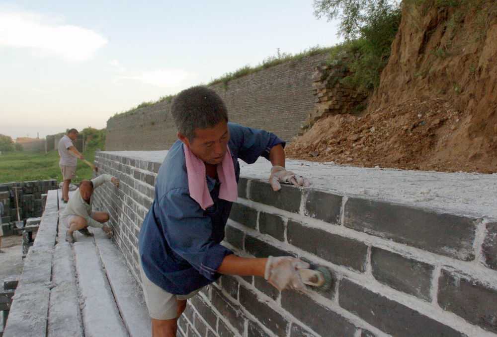 古建工人在修復山海關古城城墻(2005年8月29日攝)。新華社發