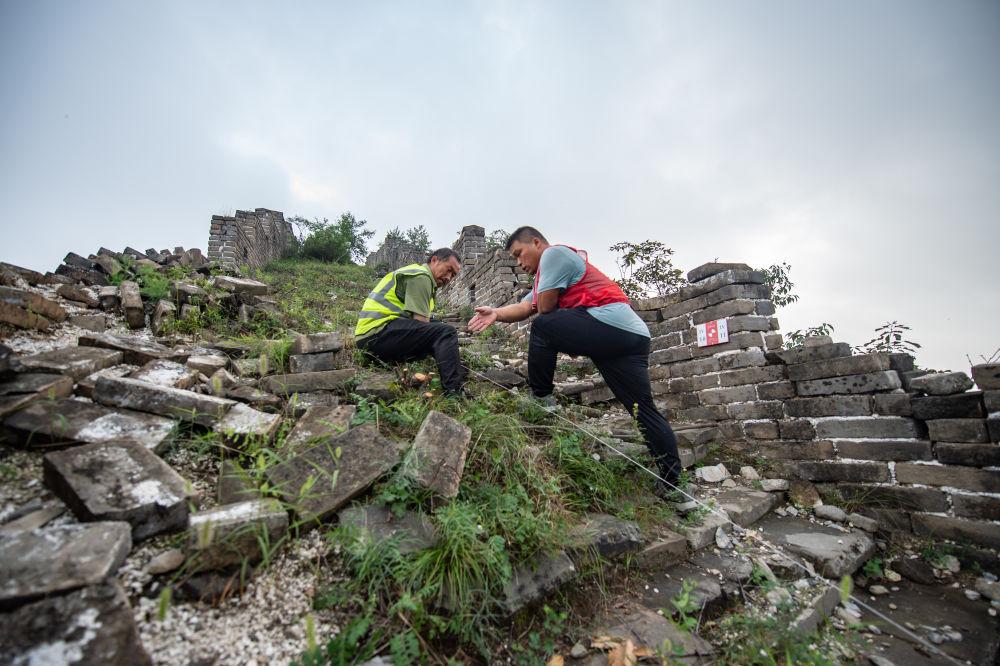 技工楊戰杰(右)在指導工人拉線劃設北京箭扣長城研究性修繕考古發掘范圍(2022年8月17日攝)。新華社記者 陳鐘昊 攝