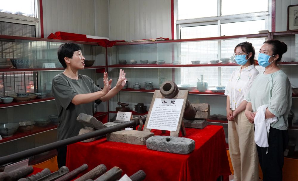 在秦皇島市海港區的長城文化展館,長城保護員李翠(左一)向游客介紹長城文化知識(2021年7月8日攝)。新華社記者 金皓原 攝