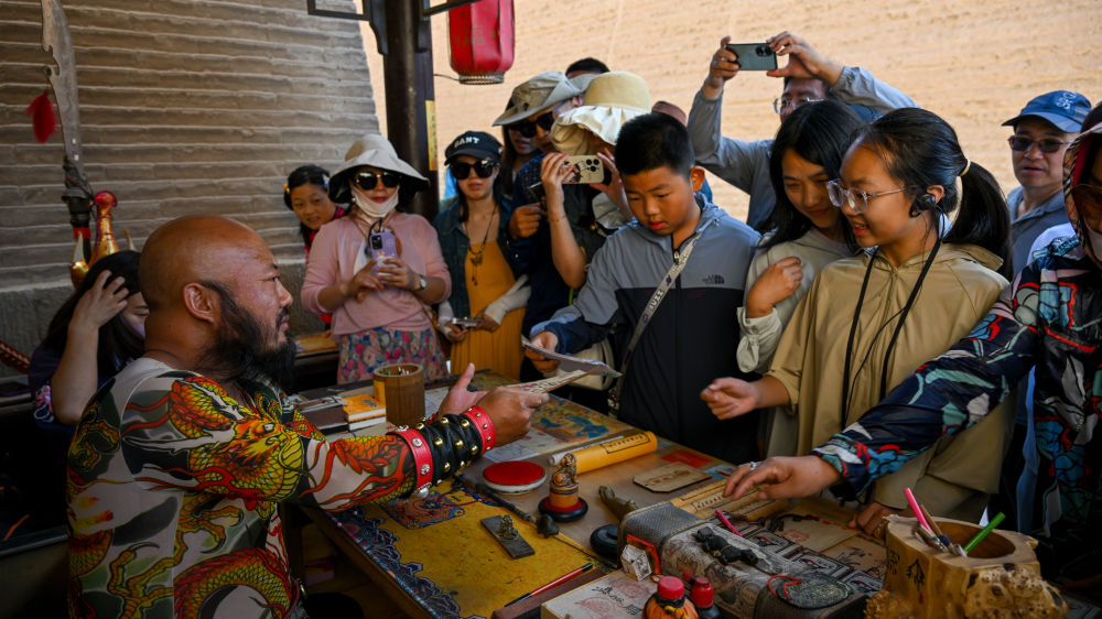 在甘肅嘉峪關關城景區,網紅“關長”李森(左)為游客奉上自己手寫好的文創產品“關照”(2023年7月14日攝)。新華社記者 劉金海 攝