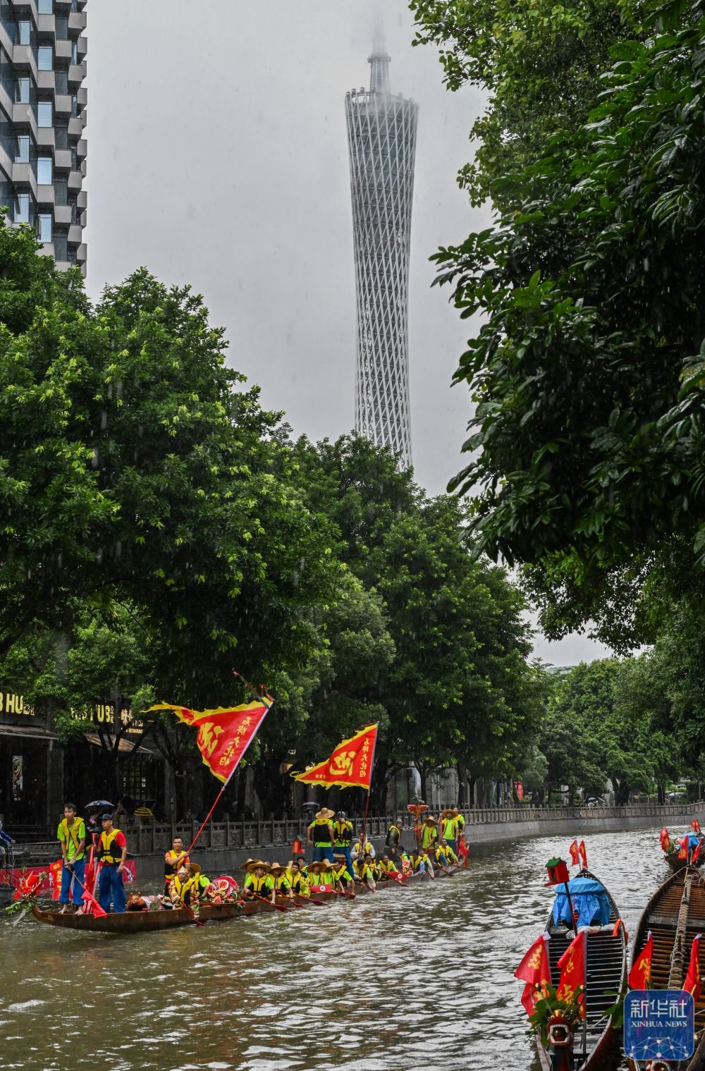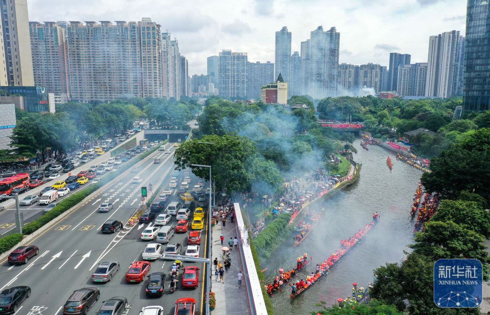 6月10日,獵德村熱鬧的傳統龍舟“龍船景”與繁忙的現代都市交匯相融(無人機照片)。“龍船景”是廣府地區水鄉在端午期間舉辦的一種民俗活動。新華社記者 劉大偉 攝