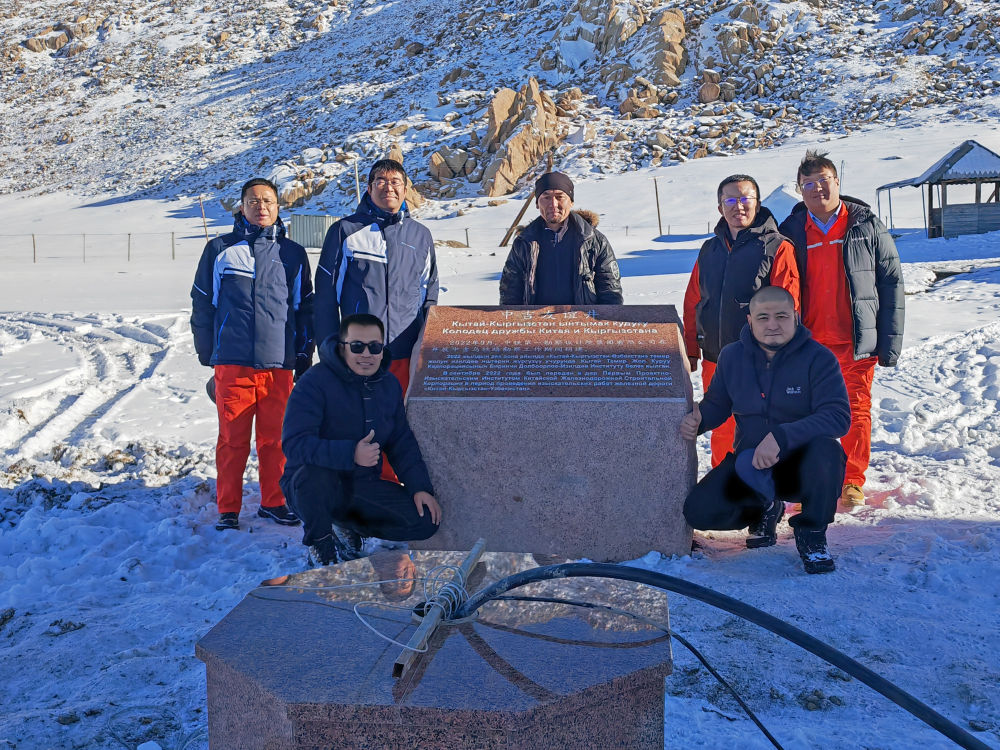 執(zhí)行中吉烏鐵路可行性研究的中鐵第一勘察設(shè)計(jì)院專(zhuān)家團(tuán)隊(duì)成員在吉爾吉斯斯坦納倫州的“中吉友誼井”(前)和紀(jì)念石碑旁合影(2022年11月26日攝)。新華社發(fā)(中鐵第一勘察設(shè)計(jì)院供圖)
