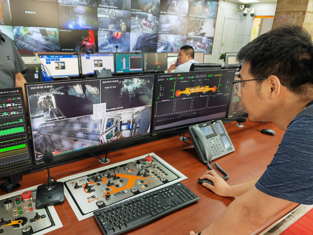 在山西省霍州市的山西焦煤集團李雅莊煤礦,綜采隊技術(shù)員在井上控制井下割煤機(2024年5月29日攝)。