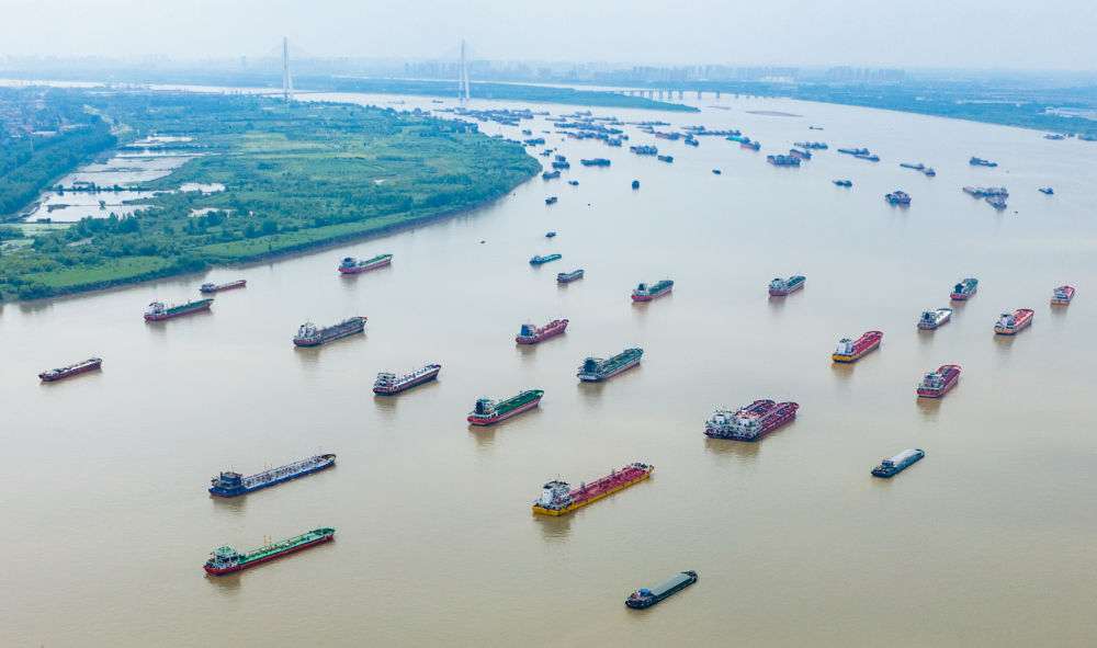 2024年6月1日,船舶在湖北武漢市陽邏港區水域行駛(無人機照片)。新華社記者 杜子璇 攝