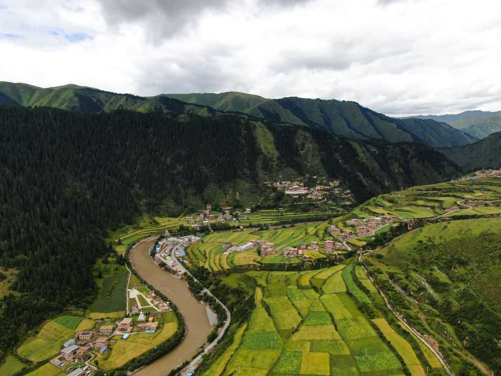 青海省果洛藏族自治州班瑪縣境內拍攝的村莊景色(2021年8月7日攝,無人機照片)。