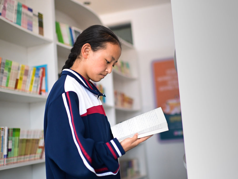 6月18日,果洛西寧民族中學學生尼東拉毛在圖書室看書。