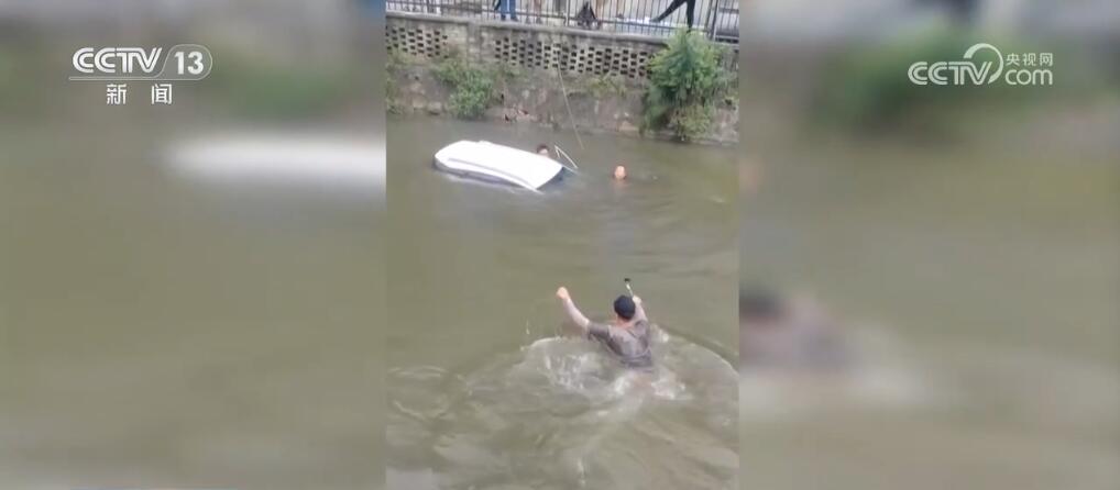 畫面中可以看到,這輛白色小車即將被河水沒過車頂。緊急關(guān)頭,三名熱心群眾先后跳下河涌,聯(lián)手營救被困司機(jī)。同時岸邊群眾也立即報(bào)警,請求救助。
