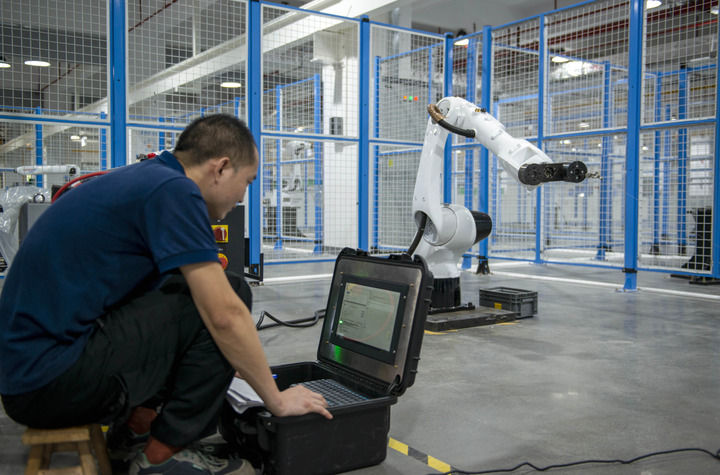 在廣東拓斯達科技股份有限公司,工作人員對一臺工業機器人進行絕對定位精度的校準(5月17日攝)。新華社記者 徐嘉懿 攝