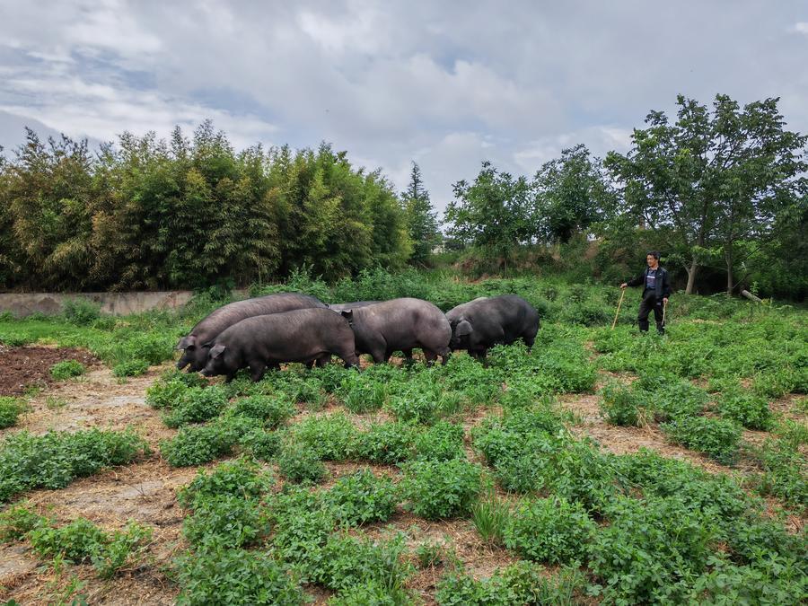 6月2日,云南老浦家火腿實業發展有限公司養殖的烏金豬在覓食。新華社記者 林碧鋒 攝