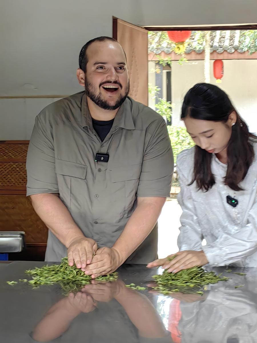 5月29日,新華社古巴籍記者塞爾希奧·戈麥斯(左)在云南省普洱市思茅區體驗制茶。新華社記者 李曄 攝