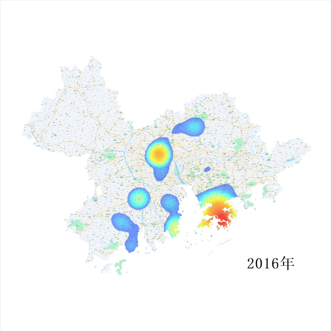從2016至今,即使相隔珠江口,大灣區區域顏色不斷加深,各熱點之間聯系更加緊密。