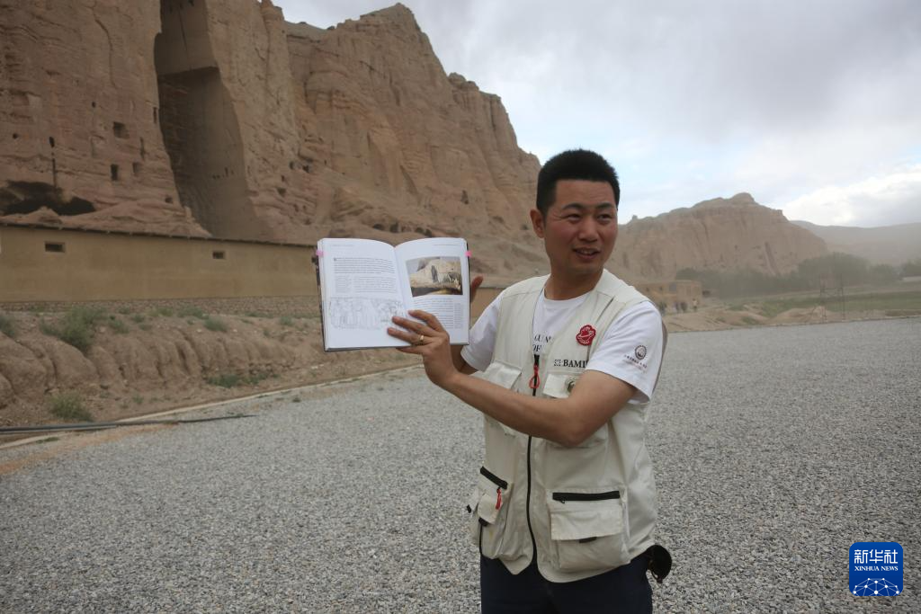 6月15日,在阿富汗巴米揚省的巴米揚大佛遺址區(qū),中國學者邵學成展示書中記載的巴米揚大佛相關內容。新華社發(fā)(塞夫拉赫曼·薩菲攝)