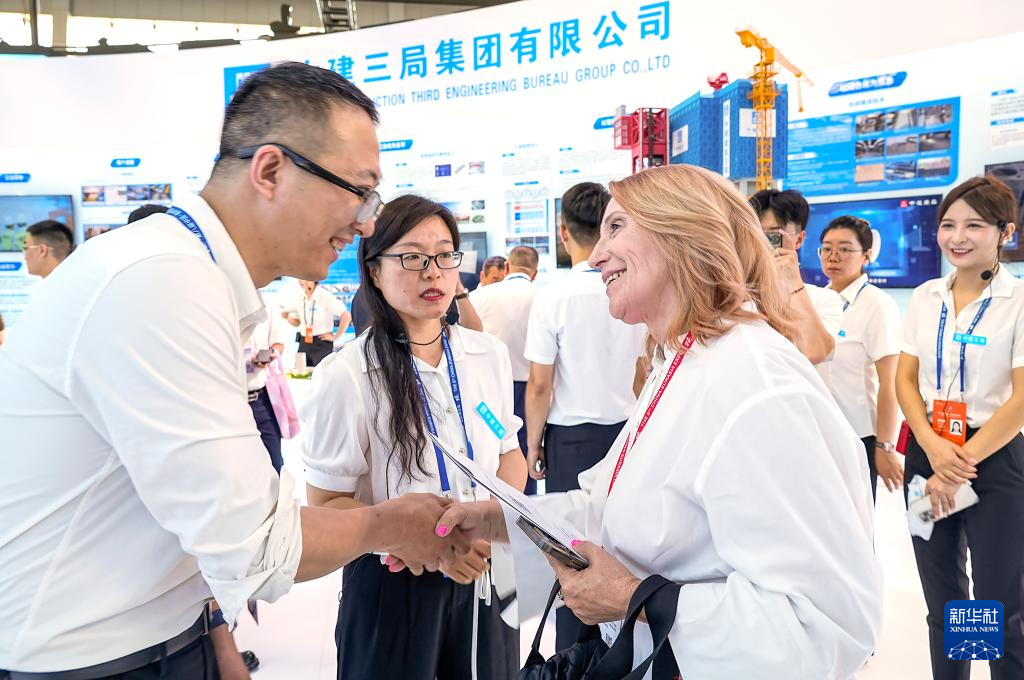 2024年6月27日,在第八屆中國—亞歐博覽會上,吉爾吉斯斯坦企業客商(前右)與中建三局參展商初步達成協議。新華社記者 王菲 攝